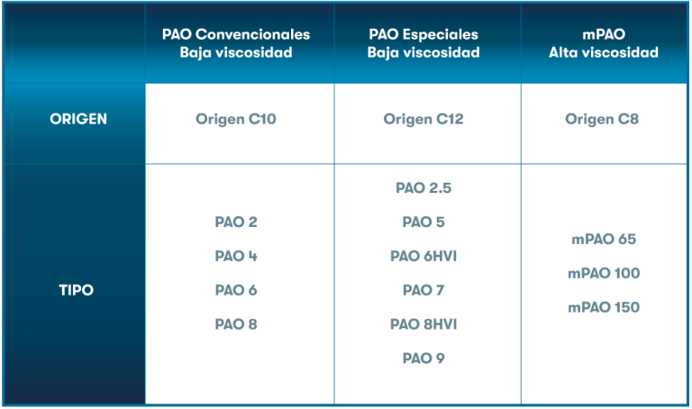 Las PAOs (PAO) son bases sintéticas obtenidas de monómeros de etileno (alfaolefinas) polimerizadas en presencia de catalizadores, obteniendo moléculas de mayor tamaño (polialfaolefinas). En cambio, las PAOS metalocénicas (mPAO) son bases sintéticas obtenidas de la misma forma que las PAO pero en presencia de un catalizador de metaloceno. Las mPAO tienen una estructura en peine uniforme que carece de cadenas laterales cortas, mientras que los PAO tienen cadenas laterales largas y cortas en una orientación aleatoria a ambos lados de la cadena principal.