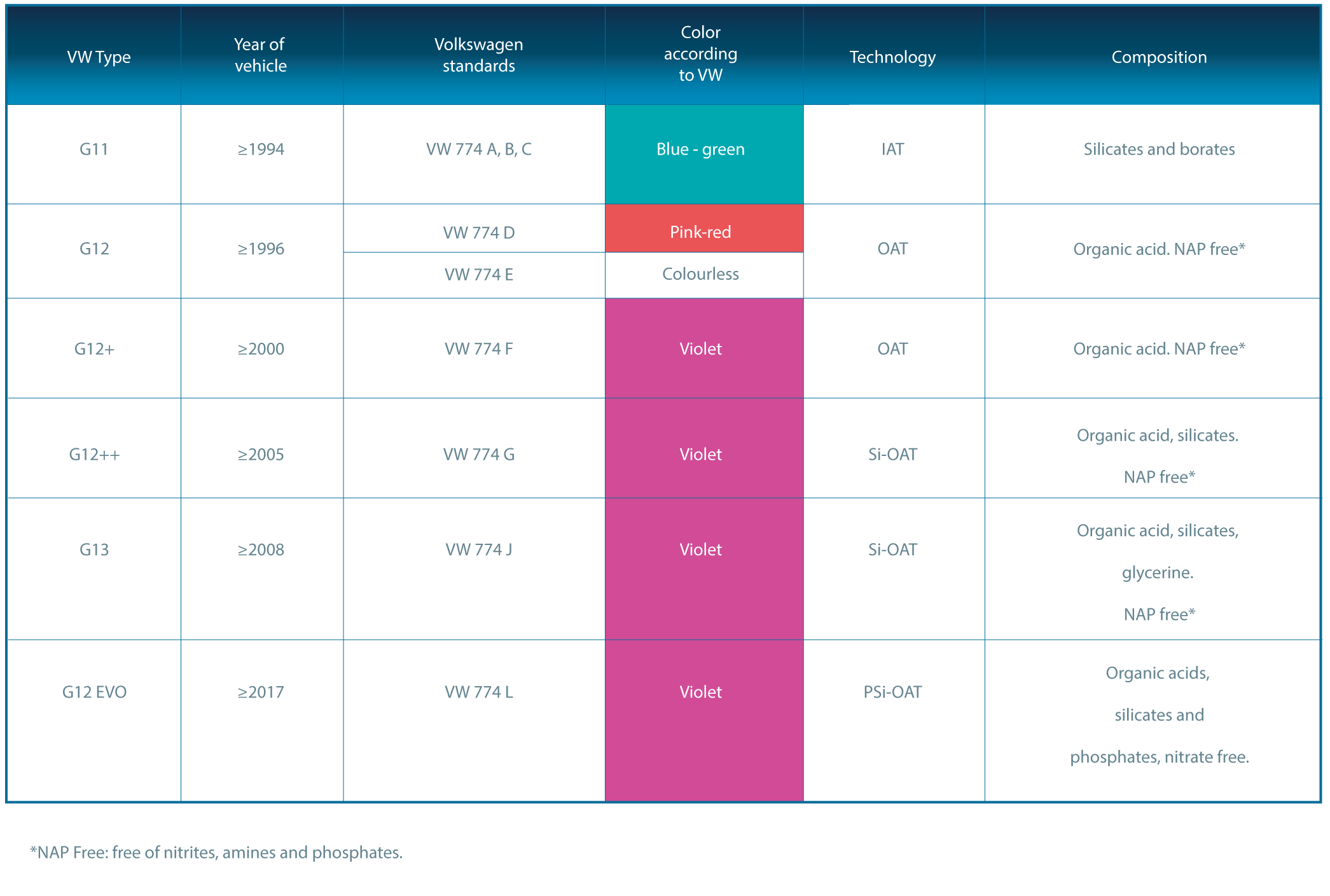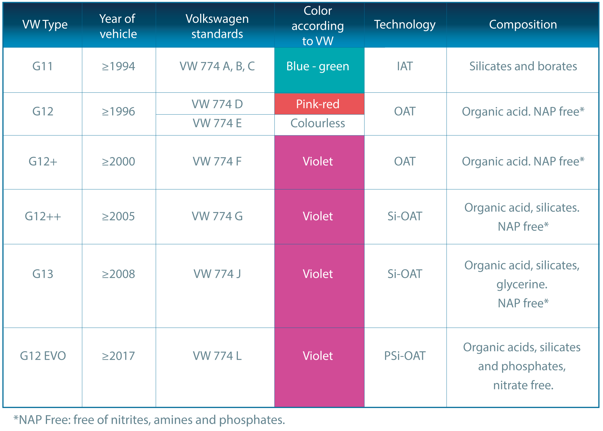 – NOAT: based on organic acids, containing nitrites and/or molybdenum, free of silicates and phosphates.